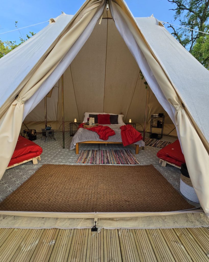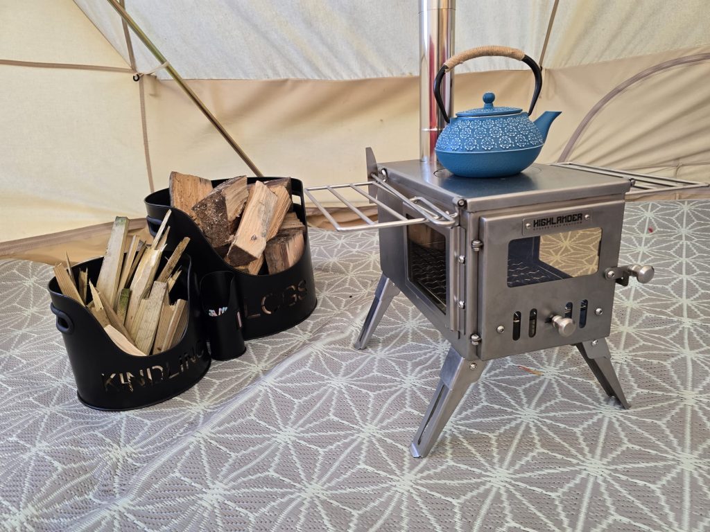 Our large emperor tent comes with one double bed and two small double futon beds and sleeps up to six. Each of our smaller bell tents come with one double bed and two single beds. All our tents have bedding provided and a small wood burning stove inside for the colder evenings. Outside each bell tent there is a picnic bench along with a BBQ fire pit, prefect for some “al fresco” dining on those warm summer evenings. A complimentary bag of wood will be supplied, and any further logs can be purchased from us if required.